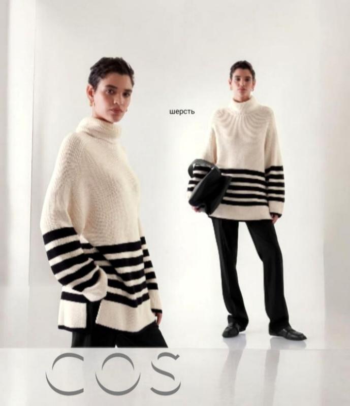 Светр COS із вовни та бавовни оверсайз Елегантний і затишний светр від преміального бренда COS — втілення мінімалізму та якості. Виготовлений із м'якої натуральної пряжі з високим вмістом вовни (63%) та бавовни (37%), він дарує комфорт і тепло в прохолодні дні, залишаючись водночас повітропроникним і приємним до тіла. Модель виготовлена в об'ємному фасоні з високим коміром-гольфом і характерною структурною в'язкою. Склад: 63% вовна, 37% бавовна Бренд: COS (Collection of Style, Швеція) Колір: молочно-чорний, у смужку Особливості: щільне в'язання, високий комір, вільний крій, бічні розрізи Бирка з розміром L Пог до 64 рукав від шиї 79 довжина 85/89