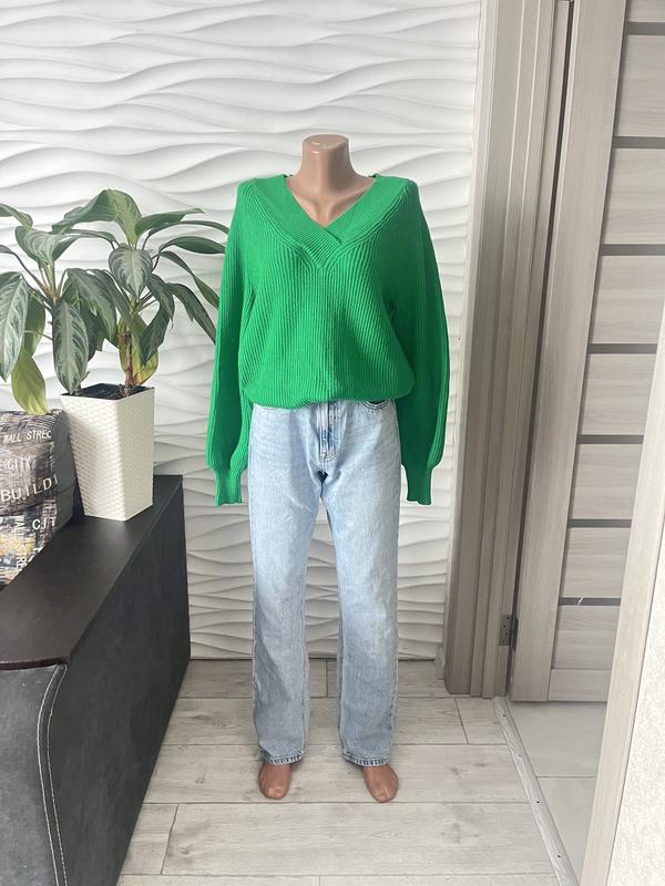 Стильна в’язана кофта насиченого зеленого кольору. Має V-подібний виріз горловини та фактурну рубчасту в’язку. Вільний крій, довгі рукави з манжетами, м’яка й приємна до тіла. Гарно поєднується з джинсами й класичними образами, підходить для повсякденного носіння та міжсезоння. Стан новоі