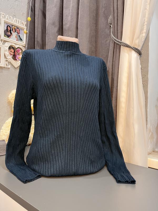 Жіночий в’язаний светр з високим коміром Стильний та універсальний светр у темному кольорі з фактурною вертикальною в’язкою. Модель з високим коміром-стійкою та довгими рукавами, добре тримає форму і підходить для повсякденного носіння. М’який на дотик, комфортний, легко поєднується з джинсами, брюками чи спідницею. Ідеальний варіант для прохолодної погоди. Заміри: • довжина виробу — 63 см • довжина рукава — 60 см