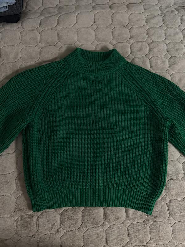 Яскравий зелений светр з виразною фактурою рельєфного в'язання. Особливості: • Високий комір-стійка для додаткового тепла • Рельєфне в'язання створює цікаву текстуру • Насичений зелений колір • Класичний крій з довгими рукавами • Еластичні манжети та низ Ідеально підходить для прохолодної погоди. Можна носити як самостійний елемент або поверх сорочки. Універсальний варіант для повсякденного гардеробу.