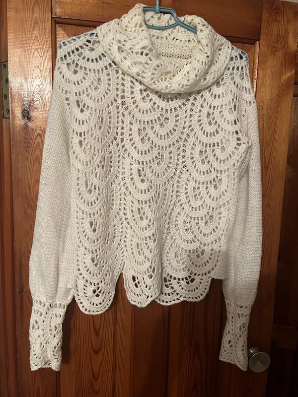 Белый вязаный свитер с ажурным воротником-хомутом, ручная работа, в единственном экземпляре. Нитки: вискоза, коттон. Идеальный, одет 2 раза, зацепок нет, не покатан, ткань не будет кошлатится.