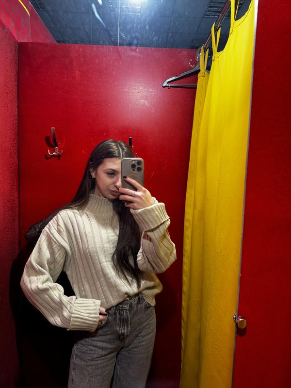 Це об’ємний в’язаний светр молочного/кремового кольору з вираженою вертикальною фактурною в’язкою. Крій: вільний, оверсайз.Горловина: висока, типу напівгольф — додає тепла й акуратності. Рукави: довгі, широкі, з подовженими манжетами.Матеріал на вигляд: м’який, щільний, теплий. Стиль: мінімалістичний, базовий — легко поєднується з джинсами, брюками чи спідницею Загалом светр виглядає дуже універсально: і на щодень, і для стильних casual-образів