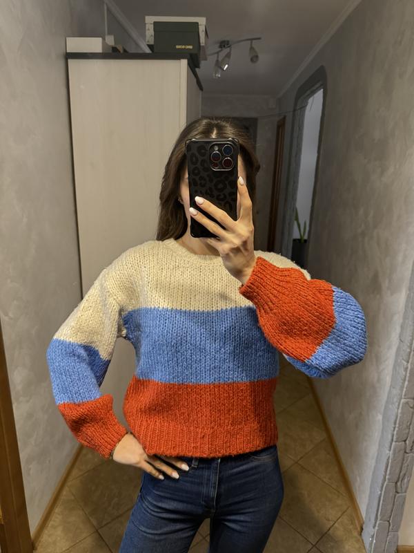В'язаний светрик у смужку Стильний в'язаний светрик з кольоровими смугами. Мʼякий, теплий та приємний до тіла. Виглядає яскраво, але легко поєднується з базовими речами. Чудовий варіант для повсякденних образів. Стан: дуже хороший Колір: молочний / блакитний / теракотовий Фасон: прямий Заміри: • Довжина — 54 см • Груди (півобхват) - 50 см • Рукав - 53 см З чим поєднувати: джинси, mom/straight спідниці, штани кросівки, черевики 📦Висилка щодня