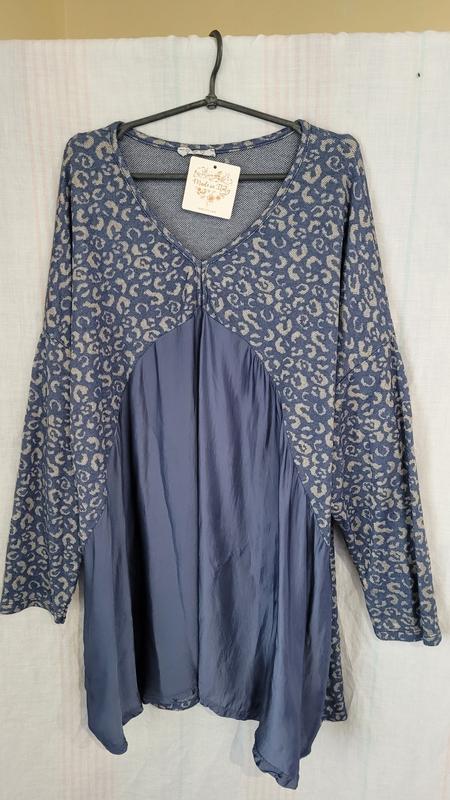 длинный тонкий свитерок оверсайз с тканевой вставкой, плечо спущено, спина чуть длиннее, цвет серосиний с песочным,ог и об 160, рукав от ворота 77, длина 82/87.