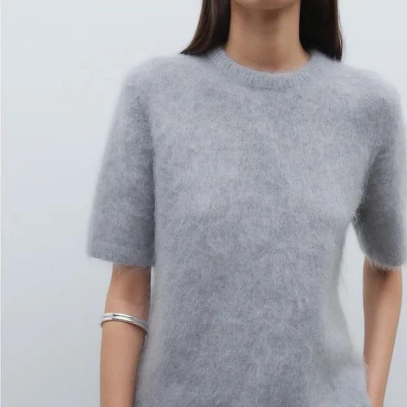 Стан відмінний. Розмір М невеличка Л Пухка кофта на короткий рукав з чудовим складом тканини в надніжному сіро блакитному кольорі. Довжина-63см Ширина під руками-53см Плечі-49см Рукав-30см