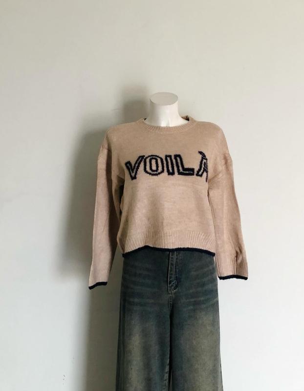 Бежевий в'язаний светр оверсайз із темно-синім написом "VOILÀ" на грудях та обробкою по краю розміру 22(4XL), краще підійде на малі розміри L,XL, (орієнтуватись на заміри), склад акрил та поліестер, мʼякий та приємний на дотик, щільної вʼязки, довжина від плеча 56см., півобхват грудей 61см., низ 62см., довжина рукава від горловини 71см. В відмінному стані без дефектів.