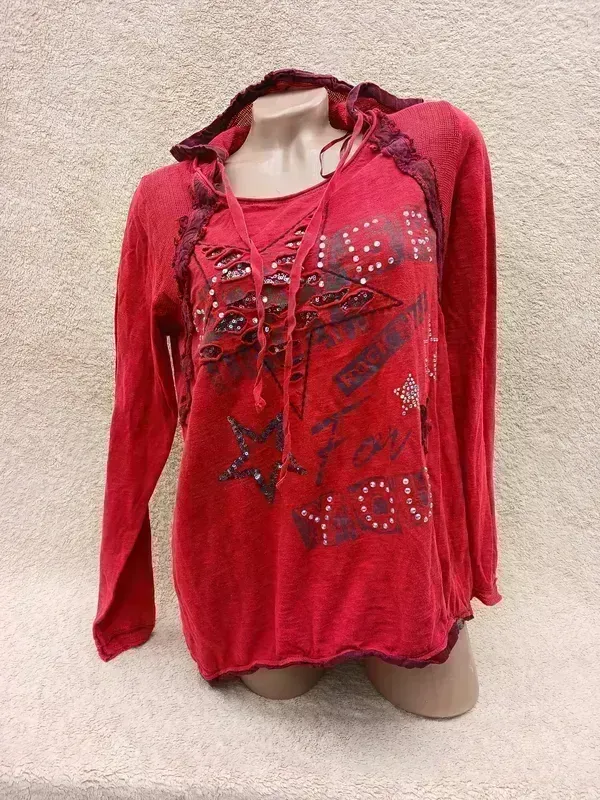 Тонкая трикотажная кофтика с капюшоном, становление красиво ПО груди 53-58, ПО низу 57-59, рукав 62, длина 65/70 Замеры отличий половина