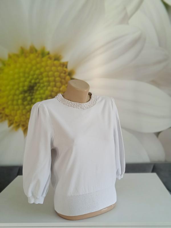Класична однотонна кофтинка з коротким рукавом білого кольору. Легка та зручна. Приємна до тіла. Гладка машинна в'язка. Нитка середньої товщини. Стрейч Лягає по фігурі. Закрита шия, прикрашена перлинами. Стан ідеальний, одягла декілька разів. Добре підійде на 38/м-36/с розмір.
