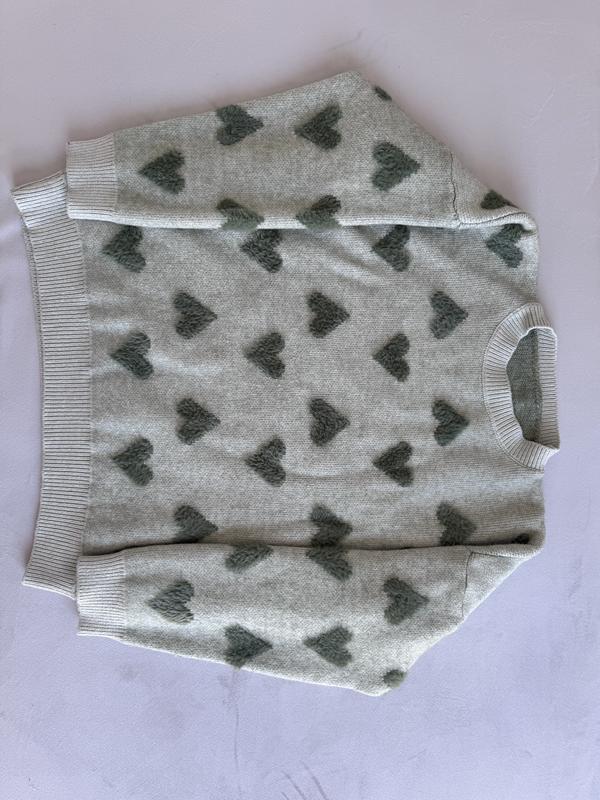 Напівобʼєм грудей - 52 см Напівобʼєм талії - 52 см Довжина виробу - 60,5 см Довжина рукава - 42 см (рукав довший, бо плече спущене) Ширина в плечах - 57 см Теплий, мʼякий, без етикетки, мабуть акрил чи поліестр, принт - серденька Маленька пляма на рукаві