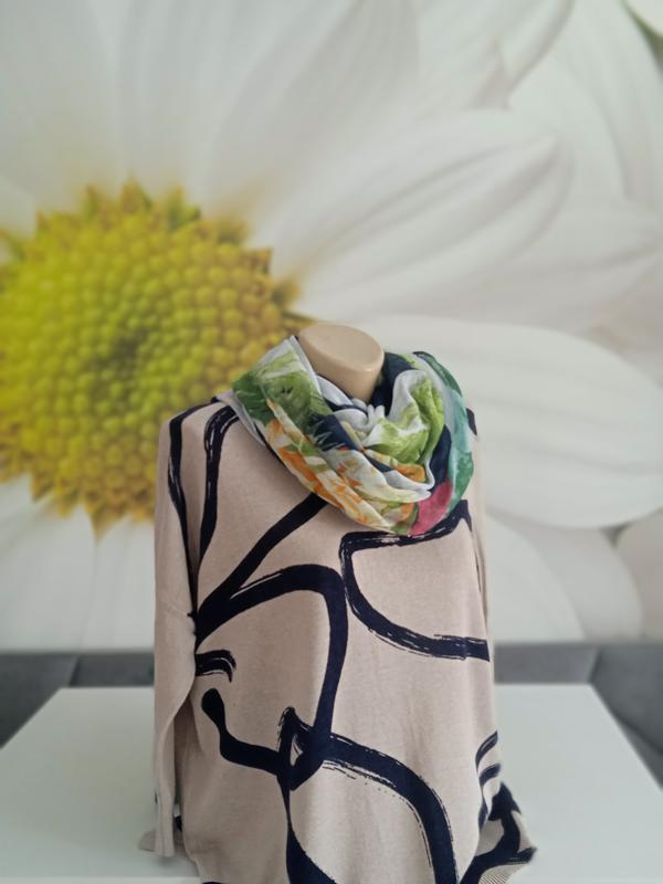 Класична кофточка з оригінальним контрастним малюнком. Цікаво поєднані кольори. Легка та зручна. Приємна на дотик. Гладка машинна в'язка. Нитка середньої товщини, більш до тонкої. Тягнеться з легкістю. Лягає вільно. Фасон прямий. Плечі спущені. Акуратний виріз. Укорочений рукавчик за лікоть. Стильно виглядає з шарфом в тон у комплекті (шарф може бути замінений, але в кольорі). Є розміри. 52р на пог-56-58 50р на пог-54-56
