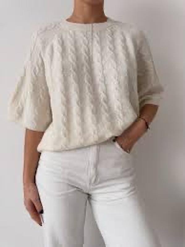 Светр вільного крою з широкими рукавами. В складі присутня вовна. Вказаний розмір EUR 48-50. Пог 70см, довжина по спинці 62см, довжина рукава від горловини 45см. Колір кремовий. Стан нового.