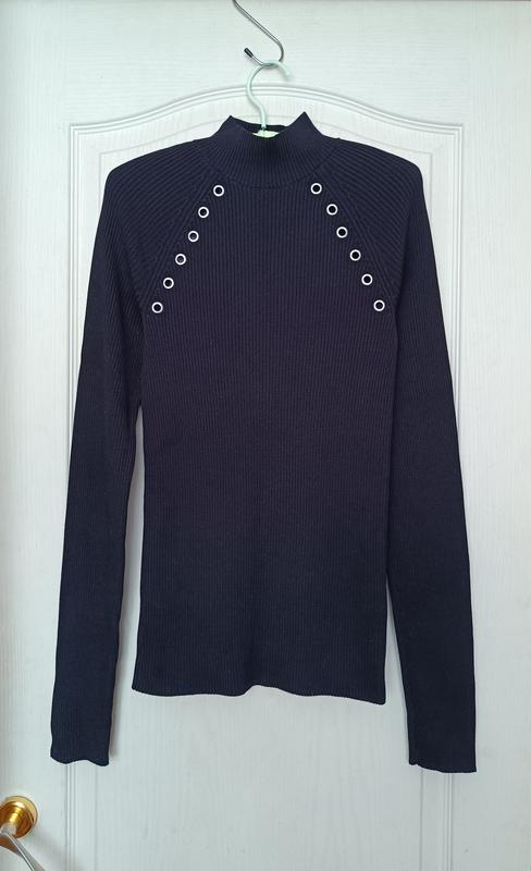 Светрик в рубчик з високою горловиною в чорному кольорі від & Other Stories. Склад: 91% віскоза, 8% поліамід, 1% еластан. Тканина приємна на дотик, не колеться. Середньої щільності. Облягаючий прямий крій, рукав реглан. Светрик прикрашений люверсами сріблястого кольору вздовж пройми рукавів спереду та ззаду. Розмір вказаний М. Заміри: Напівобхват грудей - 32,5 см, тягнеться до 52 см Ширина внизу - 33,5 см, тягнеться до 54 см Довжина по середині спинки від горловини - 64 см Довжина рукава від горловини - 79,5 см Висота стійки горловини - 5,5 см