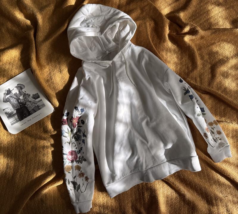 Светр з капюшоном та малюнками квіточок на рукавах. Розмір маленький: Тягнеться,щільність середня. Довжина 58,5 см/ Плечі 58 см/ Капюшон 34#23 см/ Рукав 45 см/ Пог 48 см/ Пот 47 см/ ЗНизу 46 см. З нюансів-невелика деформація та застірана / Продається без повернення/ Деталі уточнюйте щоб потім небуло непорозумінь.