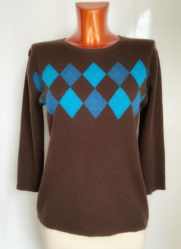Брендовий кашемвровий мягенький світер з бірюзовими ромбами, прямого крою, шоколадного кольору,середньої щільності. Заміри:-ПГ-49см, ПБ-49см, ДР-44см ( нижче ліктя), плечі-43см, ДВ-62см. Недоліків немає 👍👍👍!