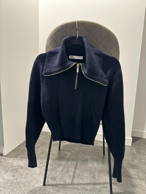 Стильний жіночий светр ZARA розмір S 💙 Темно-синій в’язаний светр із блискавкою та широким коміром. Модель має укорочений фасон, довгі рукави та еластичні манжети. Гарно тримає форму, виглядає лаконічно та сучасно. 🔹 Бренд: ZARA 🔹 Розмір: S 🔹 Колір: темно-синій 🔹 Застібка: блискавка 🔹 Стан: дуже хороший Чудовий варіант для створення стильних образів на осінь/весну 🌿 За потреби надам додаткові фото та заміри 📏