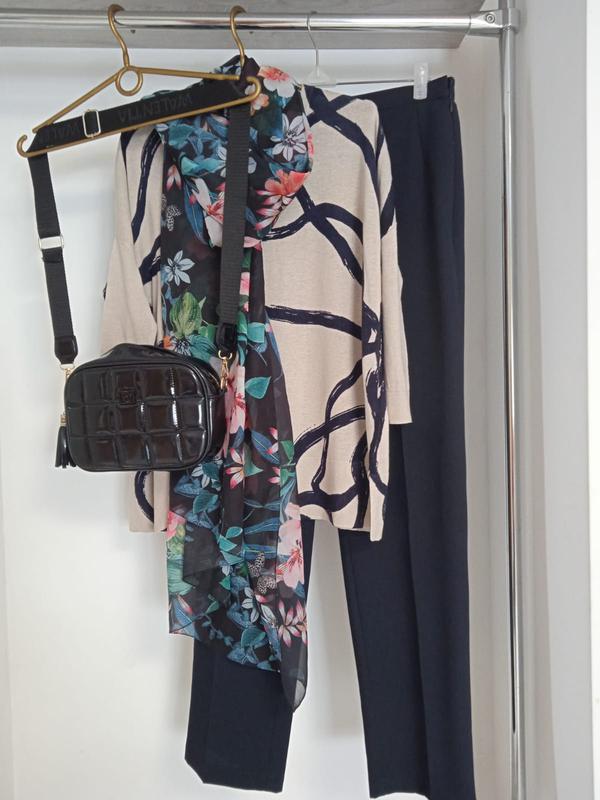 Цікава кофточка з коротким рукавом та оригінальним контрастним малюнком. Цікаво поєднані кольори. Легка та зручна. Приємний на дотик. Гладка машинна в'язка. Нитка середньої товщини, більш до тонкої. Стрейч. Лягає вільно -оверсайз. Фасон прямий. Плечі спущені. Акуратний виріз. Укорочений рукавич по лікоть. Стильно виглядає з шарфом в тон у комплекті (шарф може бути замінений, але в кольорі). Є розміри.