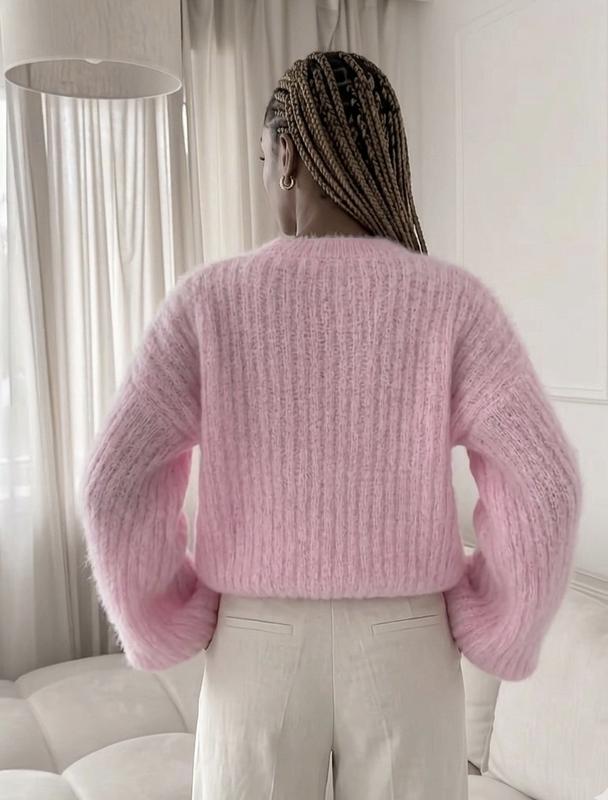 Новий жіночий светр ніжно-рожевого кольору. Основні характеристики: • Матеріал: 100% акрил • Розмір: M • Колір: рожевий • Стан: новий Светр має об'ємний крій oversize з довгими рукавами. В'язка рельєфна з вертикальними смужками.