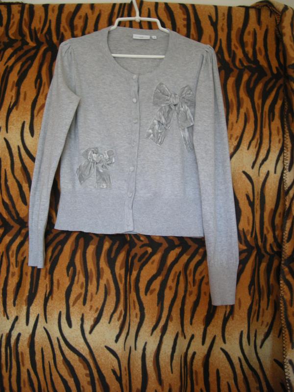 Шикарная кофта сочного серого цвета,фирменная"Look",натуральная-100%коттон, по переду два шикарных банта из серо-серебристого бархата и пуговицы тоже обтянуты такими бархатистым, низ кофты и низ рукавов-широка манжеты-резинка,объем груди-94см.,рукав длиной-68см. усобранная сверху, длина кофты-55см.