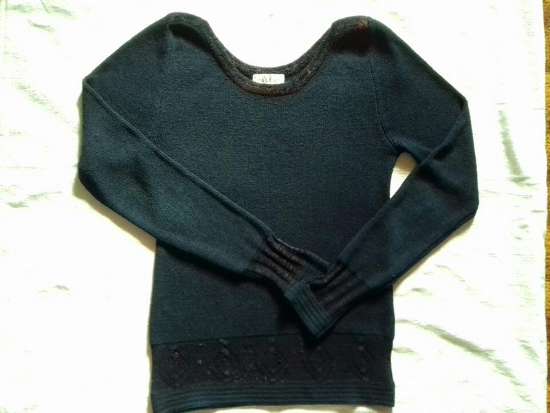 гарна трикотажна кофтинка, в дуже хорошому стані, плям і дірок немає, є трохи катишек, в шкарпетці не помітно, колір чорнильний синій, камері не вдалося передати пог - 52 см +тягнеться до 69см побіди - 43см +тягнеться до 53 см плече - 6 см довжина рукава 80 см довжина по спинці від плеча -71см виникнуть питання, задавайте, буду рада відповісти )) бирки зі складом немає, по відчуттях дуже м'яка, приємна до тіла