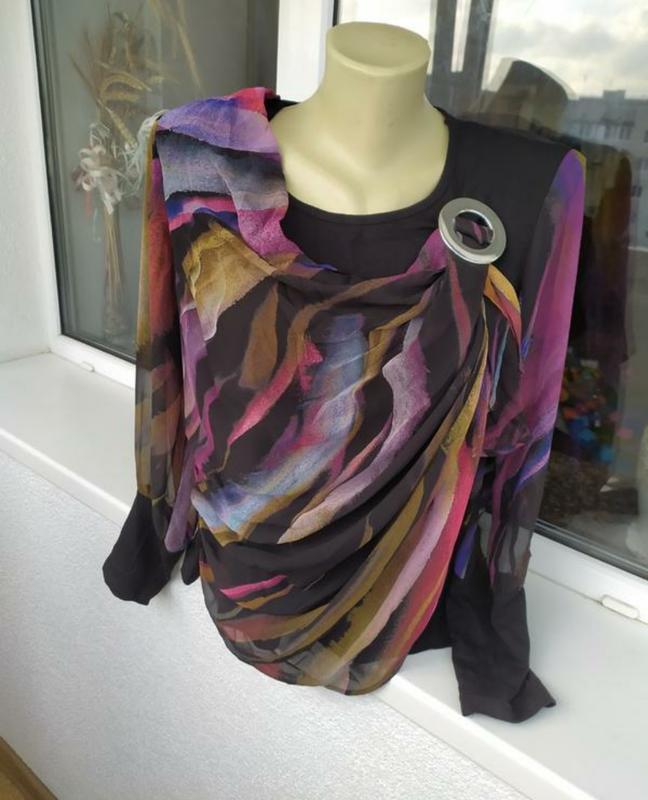 Елегантна та ошатна кофтинка. Перід кофтинки - шифон і трикотаж, зад кофтинки - трикотаж.Розмір вказаний 48. Заміри:ПОГ 54,довжина 59,ПОБІДИ 54,довжина рукава 58. За детальною інформацією, замірами, фотографіями пишіть відповім всім.