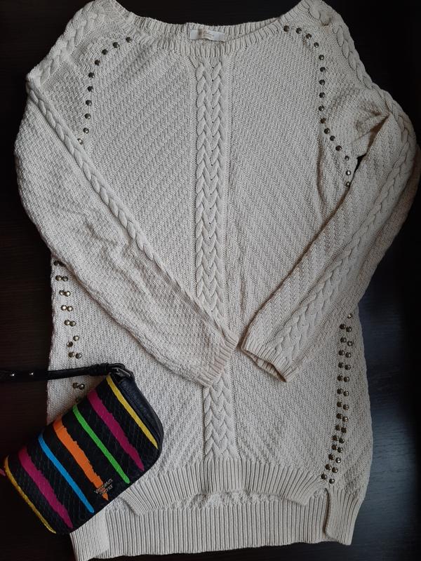 Удлинённый свитер,отличного качества мягкий и удобный,цвет молочный.Вырез лодочкой Замеры: Длина 78 зад см. перед 62 см. рукав от плеча 65 см. Пог 45 см. Поб 47 см.