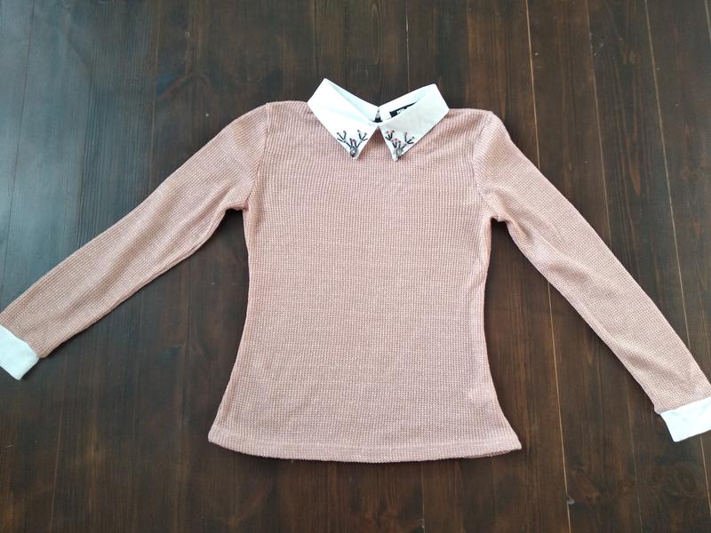 Нарядна кофточка , розмір не вказаний, але думаю на S буде. Гарний комір, прикрашений камінням. Заміри на фото.