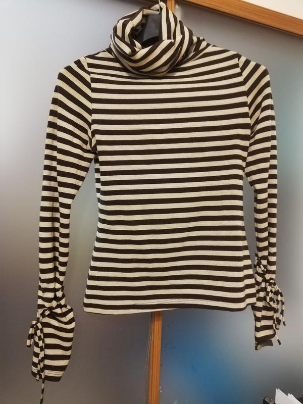 Свитер, модный с люриксом. Цвет темно коричневый и бежевый с люриксом. Ворот длинный, на рукавах бантики. Пог 46,пот 40. Длинна(без ворота) 58