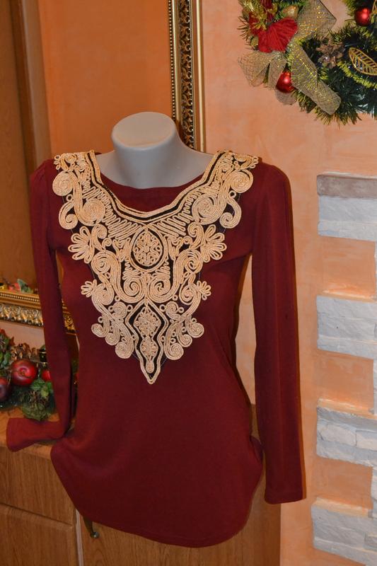 Кофта кольору бордо з нашитим узором з блискітками. Дуже оригінальна та нарядна,тянеться. Стан нової. Довжина-70см, Пог-40см,довжина рукава-58см.
