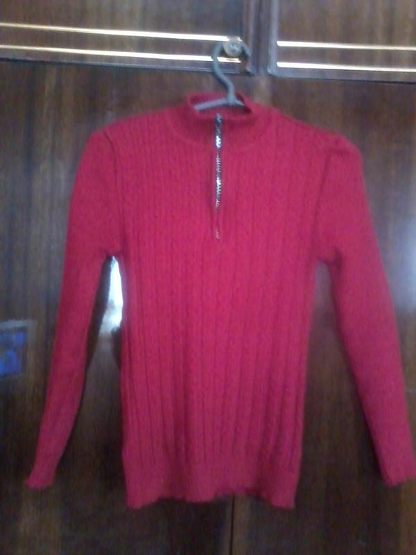 Светр темно червоного кольору із застібкою на блискавці в хорошому стані. Розмір 42. Довжина светра 56 см, довжина рукава 53 див. ПОГ 36. Колір темніший, ніж на фото, ближче до бордового