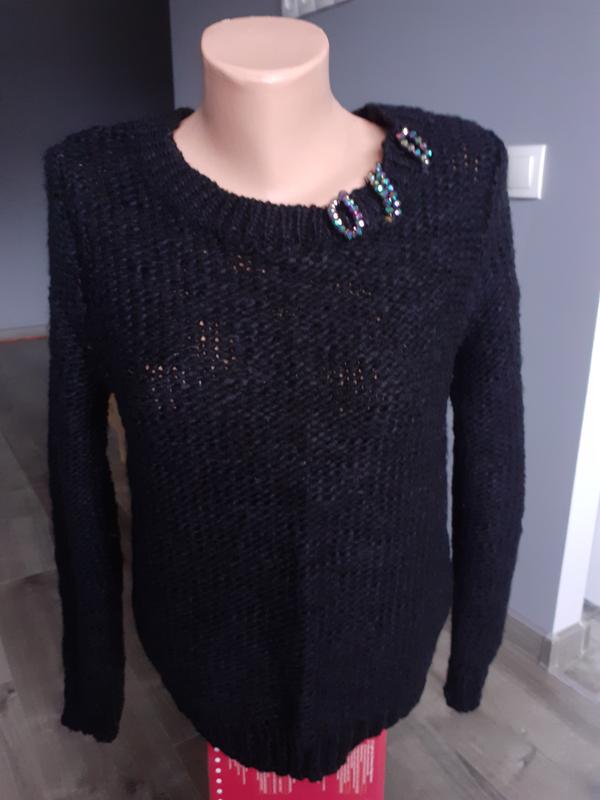 Теплий светрик з біжутерією.Велика в'язка.м'який.Заміри: довжина по спинці 56, ширина під пахвами 48, плечі 36, довжина рукава від плеча 63