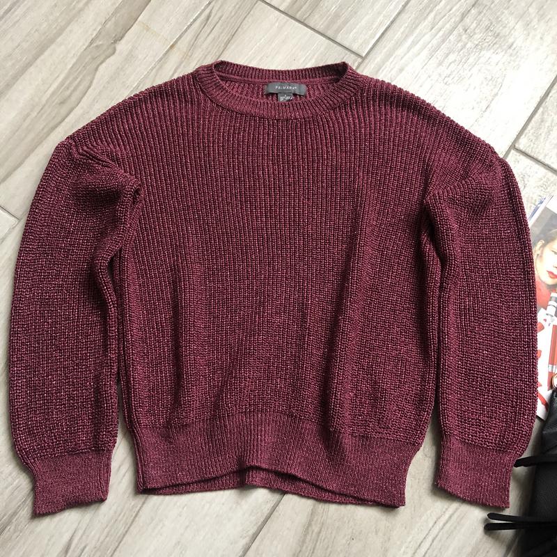 Свитер оверсайз Primark Размер S, можно и на М Длина 57 см Ширина по подмышкам 56 см Ширина по резинке 37 см Рукав от выреза 66 см С блестящей ниткой Акрил с полиэстером Тянется