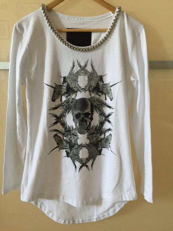 Кофта Philipp Plein, с оригинальным принтом,расшита стразами и металическими шарами. Отличный материал: 95% котон, 5% эластан. Размер XL, длинна 62 см.( спина немного длиннее), по плечам 42 см., объём груди 88 см., длинна рукава 59 см. Новая,со всеми бирками. Возможен торг.