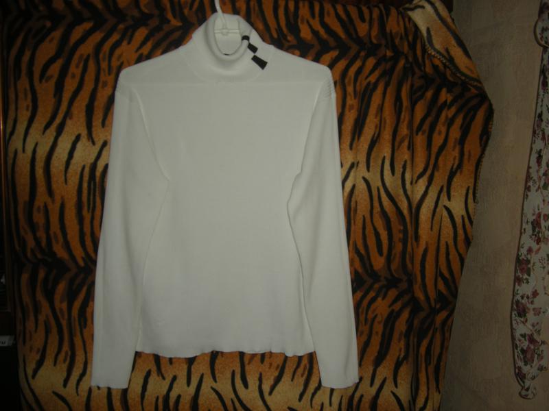 Шикарный гольф белоснежный,ткань-мелкая вязка,фирменный,натуральный,хорошего качества,впереди с левой стороны на отвороте как украшение-черная полоска,объем груди-114см.,длина рукава-62см.,длина гольфа-60см.