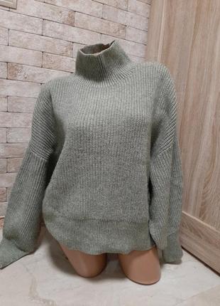 длина 57 пог 65 рукав от ворота 74 оливкового цвета Conscious Свитер из мягкой пряжи рельефной вязки с добавлением шерсти. Высокий ворот, сильно заниженная линия плеча и длинные объемные рукава. Широкая трикотажная резинка снизу на рукавах и по нижнему краю.