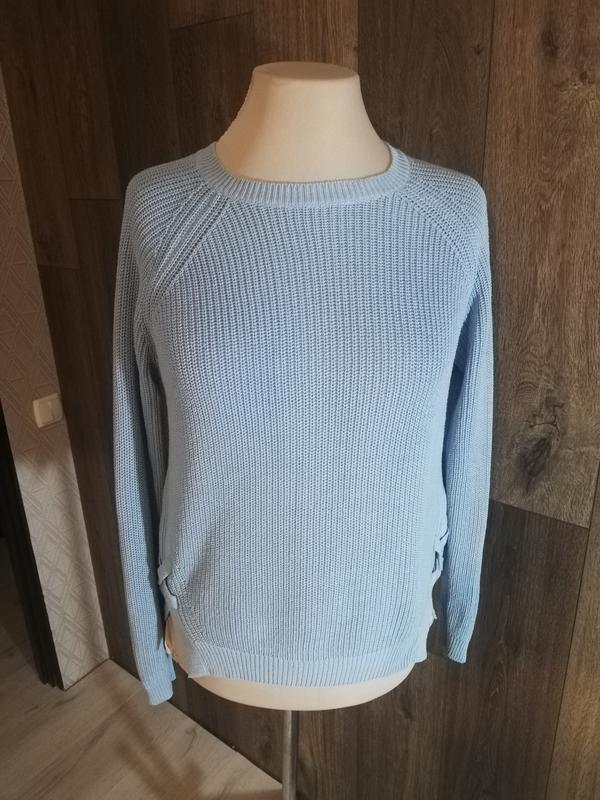 Свитер нежно-голубой.По бокам небольшие разрезы.Свитер свободный. Длина - 63см Длина рукава от горловины - 79 см Пог-54см Пот-54см Все замеры в не растянутом состоянии.