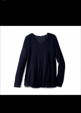 Комбинированная легкая кофта пуловер от тсм tchibo Отличительной особенностью этого пуловера являются две разные стороны: передняя часть и рукава выполнены из легкой и приятно мягкой вязки, задняя часть- воздушная вискоза. Тонкий трикотажный пуловер имеет V-образный вырез и закругленный нижний край, который удлинен на спине и украшен складкой. Рукава ребристые на концах рукавов. Материал: Перед и рукава 50% вискоза, 50% акрил Тканый материал 100% вискоза Цвет: темно-синий Размер : 54-56 ПОГ –65 см, По низу полуобхват-75 см плечи-43 см, рукав- 63 см, длина –79см.