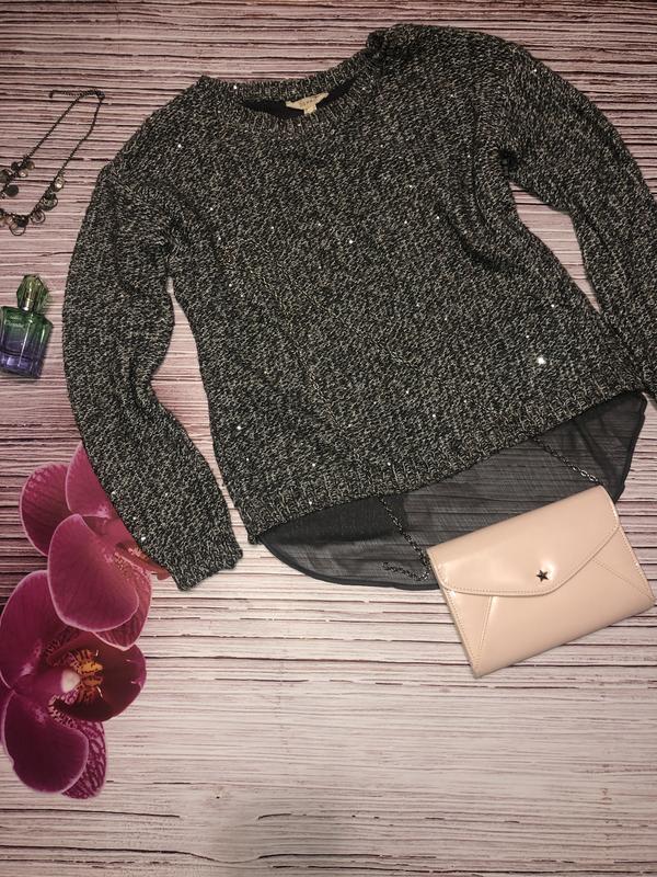 Красивий светр, фірми ESPRIT. Розмір M-L. Теплий, приємний до тіла. Дуже гарний колір, переплетення сірій, білої і люрексовою нитки + вшиті дрібні паєтки. Блищить і переливається, фото не передає. На спинці шифонова подовжена вставка.
