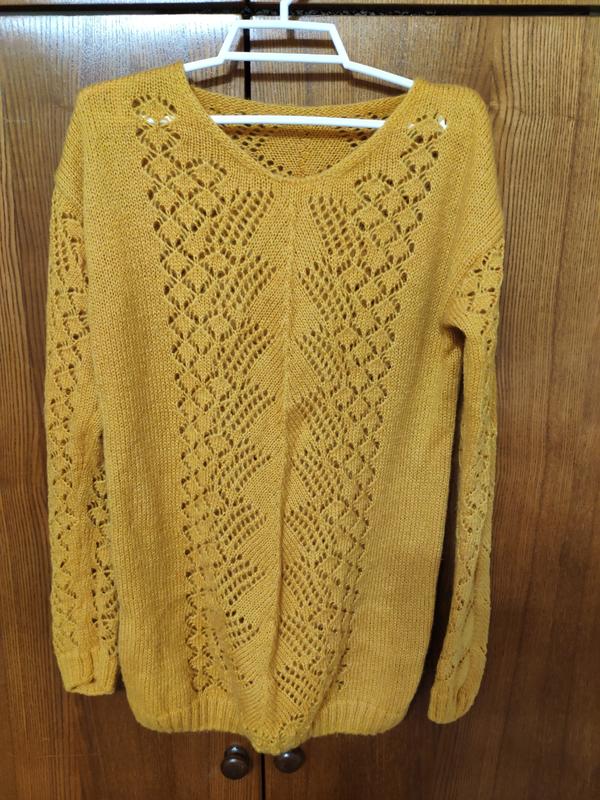 Ажурный вязаный свитер, жесть шарф в комплекте, горчичный цвет, размер с-м