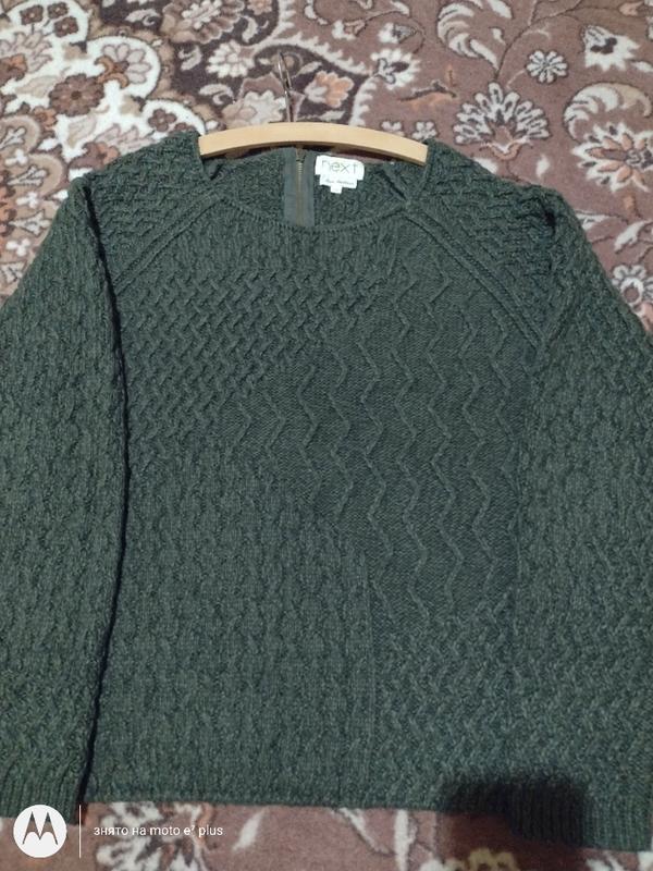 Продам об'ємний светр "Next" оливкового кольору, з цікавими візерунками, із блискавкою на спині. Розмір 16. Виміри: п/о грудей - 58 см, довжина - 61 см, рукав від горловини - 74 см.