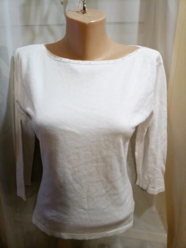 колір білий, котон, на горловині камінчики, заміри: плечі 40, обєм 41,рукав-40,доина 54, 5, вилучили вимагає прання, плям немає