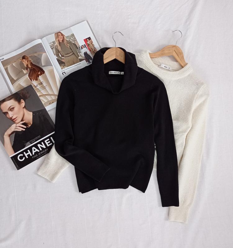 базовий чорний светр з горловиною фірми Kalamton прямого крою, м'яка м'який і теплий, тканина 65% вовна, 27% акрил, 8% спандекс, розмір вказаноЅ/M, З грудей 45 см тягнеться до 55 см, довжина 58 см, рукав 59 см