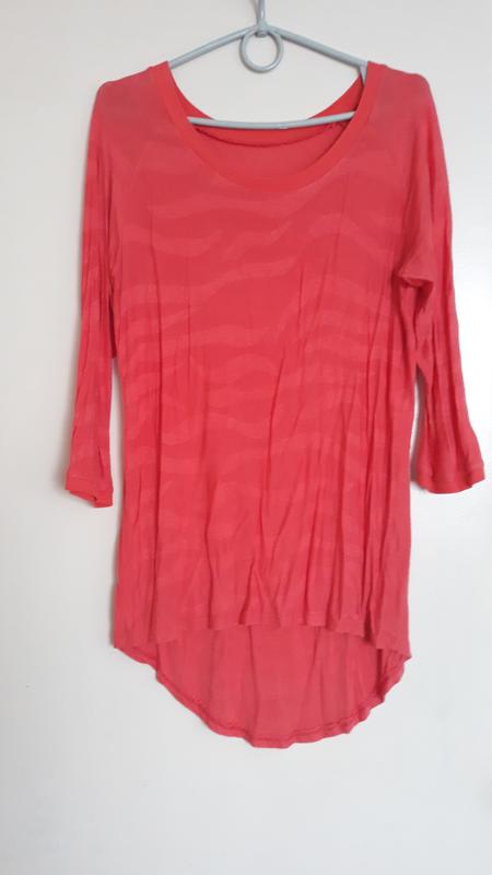 Отличная футболка кораллового цвета, асиметричный низ, рукав 3/4 Отлично тянется ткань. Сбоку малозаметные следы зацепки 🌸Больше вещей здесь, жмите ➡https://shafa.ua/member/alya.0210🌸