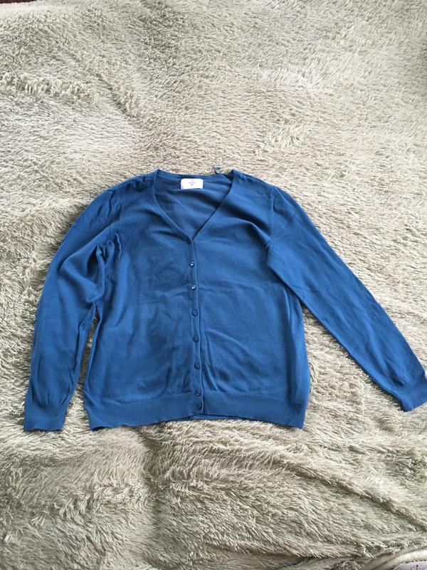 Кофточка - темно синього кольору. Розмір пише М,але підійде й на Л. Заміри: Довжина -61см Талія -48с Груди -47см Рукав повністю від плеча-60см З дефектів -трішки катишки,які практично не видно. Тканина гарно тягнеться}
