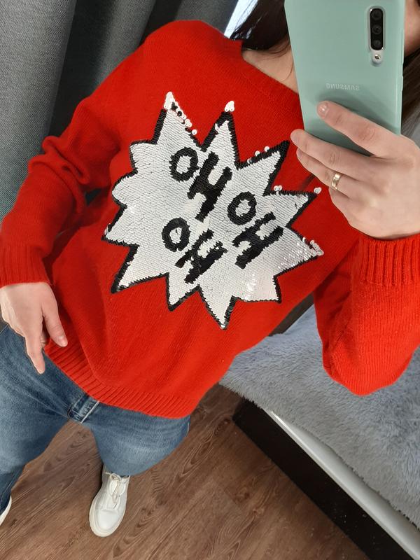 Класний светрик колір вживу не такий яскравий просто червоний, паєтки в ідеальному стані можна змінювати назву