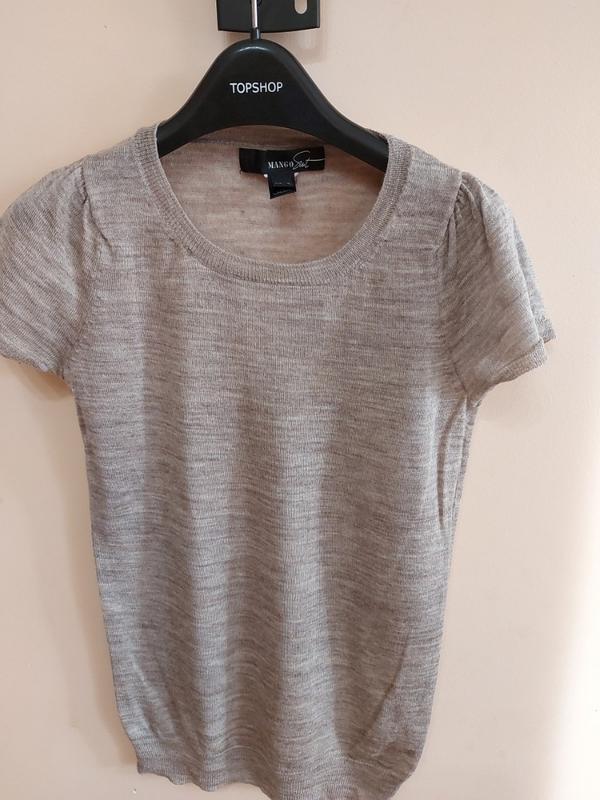 Кофточка з меланжевої ниткою, короткий рукавів. Бренд MANGO. Розмір S,M Бірочка зрізана, але тактильно у складі шерсть, віскоза і бавовна. Досить тепла. Рекомендую! Вдалих покупок!)