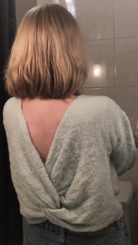 Светр, м'ятного ніжного кольору, м'який і приємний на дотик. Розмір М. Ззаду великий V-виріз. Виглядає дуже ошатно.