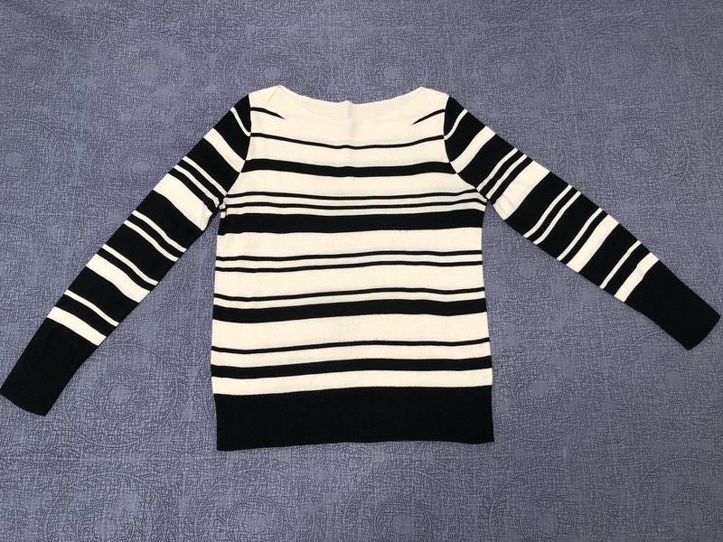 Акція! При купівлі від 3-х одиниць товару – знижка 10% на найдорожчу річ. Відмінний светр з оригінальною формою горловини - човник, широка гумка внизу і на манжетах. Принт смужка ніколи не вийде з моди. У використанні був не більше 5 раз (завеликий). Довжина - 65см, 1/2 ширини - 47см, по плечах - 40см, довжина рукава 68.