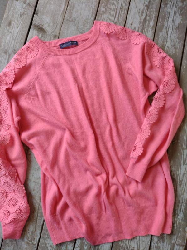 довжина зі спини 62 см пог.53 см рукава (реглан) 65см. Ошатний светрик , легкий та теплий ,приємний до тіла і на дотик. Гарна форма рукава,які прикрашені мереживом. колір насичений кораловий. Всі питання виясняйте перед ОПЛАТОЮ, будь ласка !!!