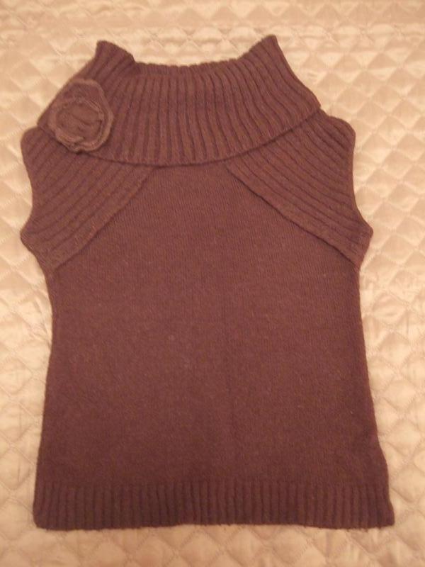 В'язана безрукавка коричневого кольору з в'язаним квіткою на комірі-муфті.
