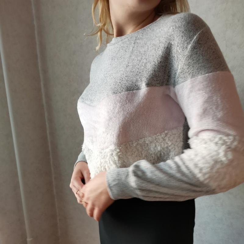 Мягенький нежный трикотажный свитер из разных фактур. Приятный к телу, тёплый. Размер указан S, но будет как оверсайз. Лучше М